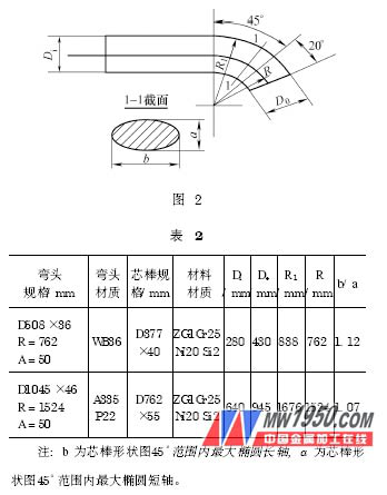 ( 2) 由于截面不圓度大及內外弧加工余量不均勻,在芯棒頭設計時可把擴徑變形段45°改為50°,整形段20°改為15°,并把擴徑變形段45°內的b/ a 值加大,即b/ a =1. 06 ~1. 10 。