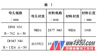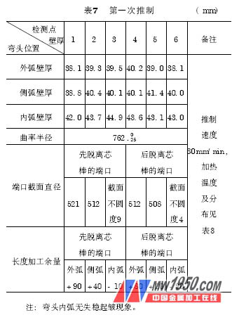 ( 5) 推制彎頭的檢測結果及分析 對推制彎頭用測厚儀檢測了外弧、側弧和內弧壁厚,用平臺劃線方式檢測了曲率半徑、端口截面直徑和長度加工余量。D508mm×36mm、R = 762mm、A = 50mm WB36彎頭的檢測結果如表7 、表8 所示。