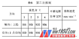 溫度分布是一個重要的工藝參數,由感應圈形狀及感應圈與芯棒頭相對位置直接控制。感應圈形狀是主要因素,感應圈與芯棒頭相對位置是次要因素。溫度沿芯棒頭軸向分布規律為低、中、高、中,溫度沿芯棒頭徑向分布規律為低、中、高。加熱溫度高,推制彎頭壁厚增大。推制D508mm×36mm、R = 762mm、A = 50mmWB36 鋼的試驗溫度如表3 、表4 所示。
