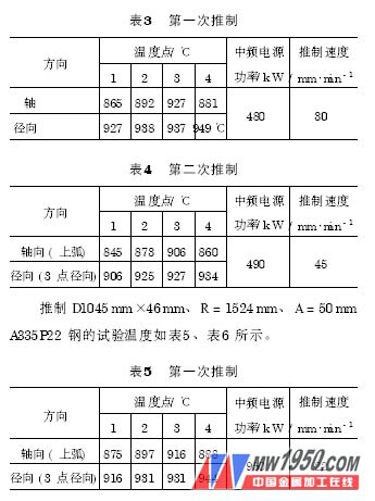 ( 4) 為保證壁厚及順利成形,WB36 材質加熱溫度最高點880 ~900 ℃,A335P22 材質加熱溫度最高點900~920 ℃。