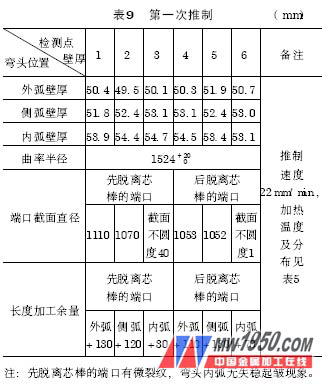 從表9 、表10 的對比中: 推制速度加快9mm/ min,曲率半徑加大84mm,即推制速度加快,曲率半徑加大。推制速度加快,加熱溫度升高,壁厚減薄5mm,即加熱溫度升高,壓縮量增大,推制速度加快,壓縮量減少。先脫離芯棒的端口,截面不圓度減少20mm,即推制速度降低,溫度升高,與模具貼合性能增強。