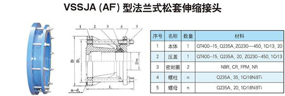 (VSSJA)AF型法蘭松套補償接頭又稱作法蘭式松套伸縮接頭、法蘭松套伸縮節(jié)。法蘭松套伸縮接頭由本體、壓蓋、密封圈和緊固件組成。它采用和壓蓋松套伸縮接頭相同的密封原理,連接方式一端為法蘭連接,另一端為承插連接,適合閥門等設(shè)備與管道的連接。連接的同時能補償管道的軸向位移,從而保護閥門等設(shè)備。