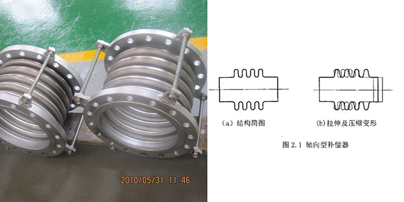 該管道補償器由一個波紋管和二個端接管構成。 它通過波紋管的柔性變形來吸收管線軸向位移。其中接管的二端與管道相連;運輸固定螺栓是保證膨脹節在運輸過程中波紋管的剛性支承。