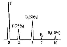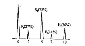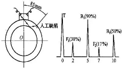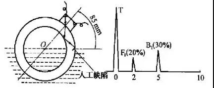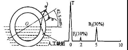 將探頭置于樣管上,找到人工缺陷,將一次通波B1調(diào)到5格,幅度為滿幅的90%,二次通波B2調(diào)到10格,管路補償接頭幅度為滿幅的50%;—次缺陷波F1在2格處,幅度為滿幅的30%,二次缺陷波F2在7格處,幅度為滿幅的17%(圖1)。