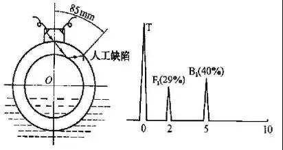 管路補償接頭此狀態(tài)下,探頭中心線至人工缺陷的周向距離為85mm,衰減器讀數(shù)為38dB。我們將此狀態(tài)定為原始狀態(tài),下面分三種情況進行試驗。