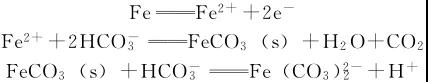 總體而言, Q345R 和 14Cr1MoR 兩種材料在單一的碳酸鹽溶液中 SCC 敏感性較低,溫度的影響不如碳酸鹽介質(zhì)的影響大。 Q345R 材料在 90℃ 下 80g·L-1的 NaHCO3溶液中,表面出現(xiàn)許多蝕孔,隔熱管托能譜顯示成分接近鋼材本體,表面無(wú)腐蝕產(chǎn)物膜存在,初步認(rèn)為表面發(fā)生了較為嚴(yán)重的 Fe 的溶解,在該溶液條件下發(fā)生了以下反應(yīng):