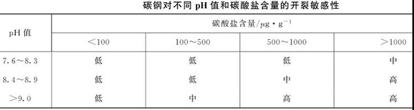 2含量超過(guò) 2% 、溫度高于93℃時(shí)可能存在開(kāi)裂傾向;下表為碳鋼對(duì)不同pH值和碳酸鹽含量的開(kāi)裂敏感性。