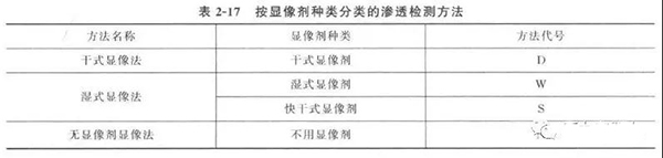 根據顯像劑和滲透劑種類不同,滲透檢測方法的分類見表2 - 17 和表2 - 18 ,各種方法組合使用的檢測步驟見表2 - 19 。