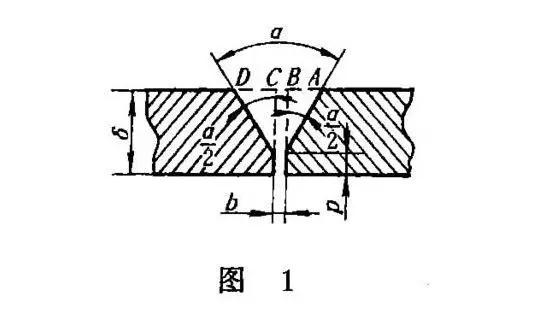 如圖1所示帶鈍邊V形坡口焊縫,坡口角度為α,間隙為b,鈍邊為P,根據解三角形的方法: