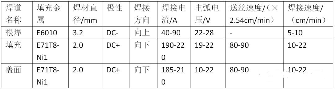 焊條電弧焊時,打底焊采用纖維素型焊條E6010,符合AWSA5.1的規(guī)定,直徑為3.2mm;填充、蓋面焊采用E5015焊條,符合GBT5117-1995的規(guī)定。藥芯焊絲半自動焊時,打底焊采用纖維素型焊條E6010,符合AWSA5.1的規(guī)定,直徑為3.2mm;填充、蓋面焊采用藥芯焊絲E71T8-Nil,符合AWSA5.29的規(guī)定,直徑為2.0mm,該焊絲具有操作性能好,焊接質(zhì)量高、抗風(fēng)能力強等優(yōu)點。