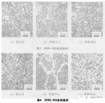 對于管道環(huán)焊縫接頭的12,3,6點位置的金相試件進行了認真觀察。采用焊條電弧焊方案得到的3點位焊接接頭金相組織照片如圖3所示;采用藥芯焊絲半自動焊得到的3點位置處焊接接頭金相組織照片如圖4所示。