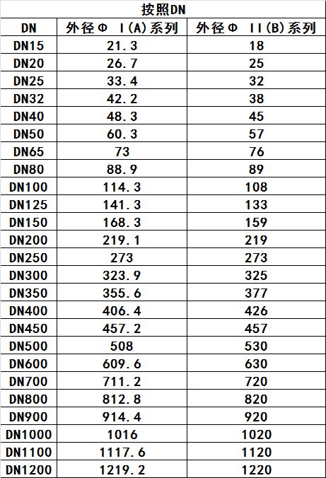 在國(guó)內(nèi)DN的數(shù)值基本很常用,但在管路、管道和管閥配件中卻只能代表一部分,為什么說(shuō)是一部分呢?因?yàn)閲?guó)內(nèi)的管路系統(tǒng)中同一個(gè)DN標(biāo)注的管道中可以有兩種外徑(Φ即為管路或管道的外徑,后面我們會(huì)詳解),如DN100,國(guó)內(nèi)有分I系列和II系列(也有用A系列和B系列來(lái)標(biāo)示),DN100I系列和A系列為Φ114.3,而DN100II系列和B系列則為Φ108。所以在出示計(jì)劃書(shū)和明細(xì)的時(shí)候DN多少后面如果沒(méi)有注明管道外徑Φ的話,用DN標(biāo)示的時(shí)候需要明確是I系列(A系列)還是II系列(B系列),這樣在采購(gòu)和詢價(jià)過(guò)程中就很明確,無(wú)需溝通和確認(rèn)就能知道是要什么樣的管道或配件的外徑。