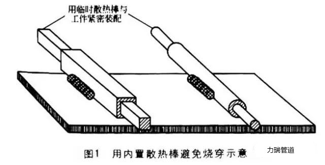 有,主要是在焊接過(guò)程中采用一個(gè)散熱棒。如將一個(gè)實(shí)心圓棒插入薄壁圓管中,或?qū)⒁粚?shí)心矩形棒插入矩形管件中,實(shí)心棒將會(huì)帶走薄壁工件的熱量并防止燒穿。一般來(lái)說(shuō),在多數(shù)供貨的中空管或矩形管材料中都緊密安裝了實(shí)心圓棒或矩形棒。焊接時(shí)應(yīng)注意將焊縫遠(yuǎn)離管子的末端,管子的末端是最易發(fā)生燒穿的薄弱區(qū)域。用內(nèi)置散熱棒避免燒穿的示意如圖1所示。