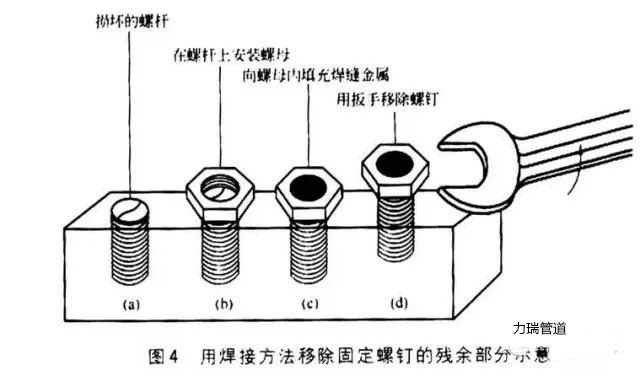 ② 如果螺釘槽、螺母或牙槽損壞或丟失,可以在螺釘頭的上部(或殘余部分)放置一個(gè)螺母,旋緊螺母,然后采用任何焊接方法在螺母和螺釘?shù)膬?nèi)部填充金屬。這樣就會(huì)將螺母和螺釘殘余部分連接起來(lái),然后在螺母上放置扳手或牙鉗,迅速拔出螺釘。采用這種方法有利于提供一個(gè)新的握力點(diǎn)并可利用熱量使螺釘緊固,用焊接方法移除固定螺釘?shù)臍堄嗖糠质疽馊鐖D4所示。