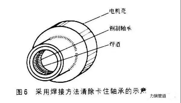 首先在軸承的內(nèi)表面焊接一條焊道,靠焊道拉伸力減小軸承直徑,外加焊接過(guò)程的熱量應(yīng)可使軸承活動(dòng)。直徑10cm的管如果在內(nèi)表面布滿焊道將會(huì)使鋼管直徑收縮1.2mm。采用焊接方法清除卡住軸承的示意如圖6所示。