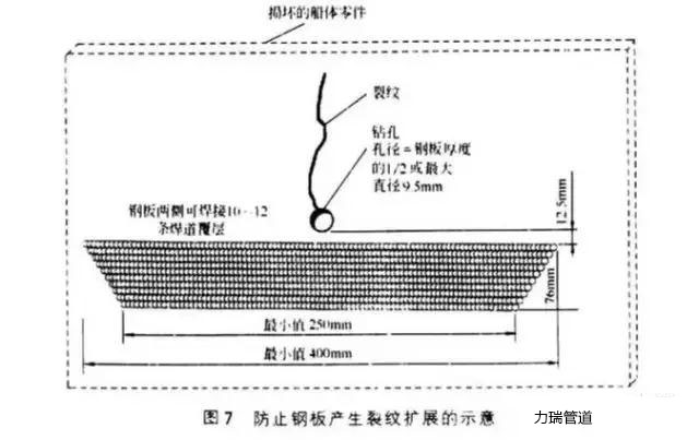 首先在裂紋末端鉆一個(gè)小孔,以利于在較大的范圍內(nèi)分散末端的應(yīng)力,然后焊接一系列長(zhǎng)度不等的多道焊縫,增加裂紋前端鋼板的強(qiáng)度。防止鋼板產(chǎn)生裂紋擴(kuò)展的示意見(jiàn)圖7。
