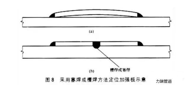 解決的方法是在加強(qiáng)板中間部位采用塞焊或槽焊,將加強(qiáng)板表面與基板表面貼緊,消除變形以利于進(jìn)行機(jī)械加工。采用塞焊或槽焊方法定位加強(qiáng)板示意如圖8(b)所示。