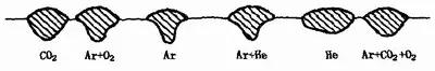 (6)保護氣體成分 氣體保護焊時,保護氣體的成分以及與此密切相關的熔滴過渡形式對焊縫形狀有明顯影響。采用不同保護氣體進行熔化極氣體保護焊直流反接時,焊縫形狀的變化,見圖1—35。射流過渡氬弧焊總是形成明顯蘑菇狀焊縫,氬氣中加入O2、CO2或H2時,可使根部成形展寬,焊縫厚度略有增加。顆粒狀和短路過渡電弧焊則形成的焊縫形狀寬而淺。