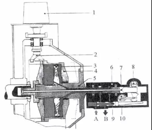 1—碟片;2—調節桿;3—活塞; 4—油缸;5—接收軸;6—控制頭;7—位置反饋桿;8—輸出軸;9—控制滑伐;10—輸入軸;