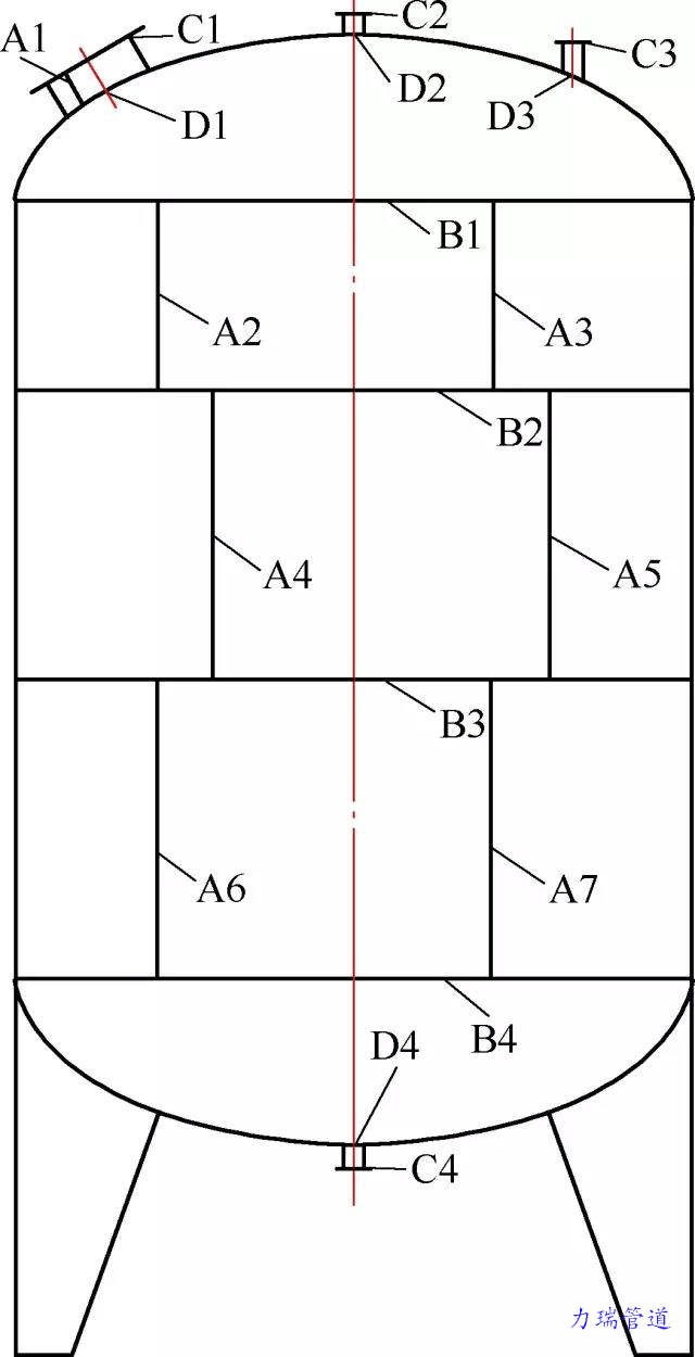 首先生產前要對使用的材料進行檢測,包括化學成分和力學試驗,材料經檢測合格后才能投入使用,這主要是保證材料的安全性和可靠性。根據容器的圖樣,做出下料尺寸,然后就可以做出標有焊縫的容器簡圖。一般容器代號分為A、B、C、D四類。A代表縱焊縫、B代表環焊縫,C代表法蘭端面焊縫,D代表接管焊縫。將字母標注在每道焊縫上,并按序標上數字(見圖1)。隨后將標注好字母與數字的容器簡圖交給車間,讓操作者熟悉這些焊縫,因為這些焊縫都是受壓焊縫,有不同的焊接工藝。