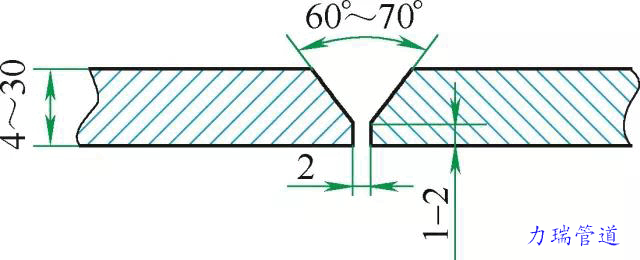 (2)焊縫的對接 從圖1可看出A類焊縫(縱焊縫)有7處,A1~A7。B類焊縫(環焊縫)有4處,B1~B4。縱焊縫和環焊縫是容器上的關鍵焊縫,也是重點監測焊縫。按照隔熱管托工藝要求,在對接前在焊縫處加工出坡口。因為容器用鋼板厚度不同,所以坡口也不同。一般情況下板厚在4~30mm之間,采用V形坡口(見圖2)。有時坡口形式也會標注在圖樣上,并注有技術說明。加工坡口根據鋼板的厚度可選用坡口機、碳弧氣刨、角磨機等,加工好坡口后要進行檢驗:①不能有裂紋。②不能分層。③不允許有熔渣。④表面需平整。焊前,坡口表面要進行擦洗,清除表面及坡口周邊的氧化物、油污和夾雜等妨礙正常焊接的雜物。