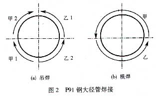 大徑厚壁P91管均應采用雙人焊接,打底時一人焊接,一人從另一側進行監視打底焊情況,如圖2所示。