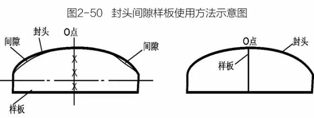 檢查時應使樣板垂直于待測表面,并且使封頭樣板中心線的O點與被檢封頭的中心點對準,重合。見圖2-50。