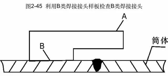 壓力容器筒體的B類焊接接頭的對口錯邊量、焊縫余高等可以用焊接檢測尺檢驗、測量。因尺寸和結構原因,用焊接檢測尺無法進行檢測時,則要采用B類焊接接頭檢驗樣板,見圖2-44、圖2-45。