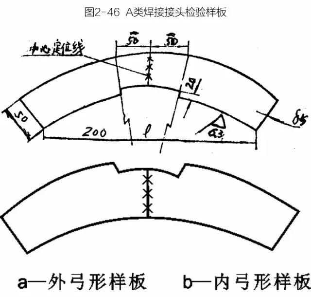 A類焊接接頭檢驗樣板用于檢驗和測量筒體A類焊接接頭的對口錯邊量、焊縫余高等。A類焊接接頭檢驗樣板又分為外弓形樣板和內弓形樣板兩種,見圖2-46。