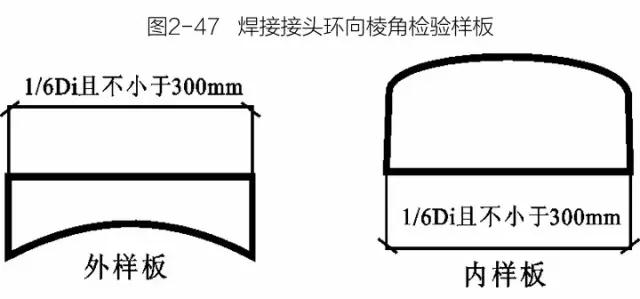 在焊接接頭環向形成的棱角E用弦長等于1/6內徑,且不小于300mm的內樣板和外樣板檢驗、測量,見圖2-47和圖2-48。